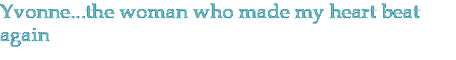 |  | My heart was keeping time. Then I met Yvonne and my heart beat again with purpose. She touched my heart, she touched my soul, she is my love. I can hear her heart beat for a thousand miles And the heaven's open every time she smiles And when I come to her that's where I belong Yet I'm running to her like a river's song She give me love, love, love, love, crazy love She give me love, love, love, love, crazy love (Van Morrison) "And now these three remain: faith, hope and love. But the greatest of these is love." (1 Corinthians 13:13) |